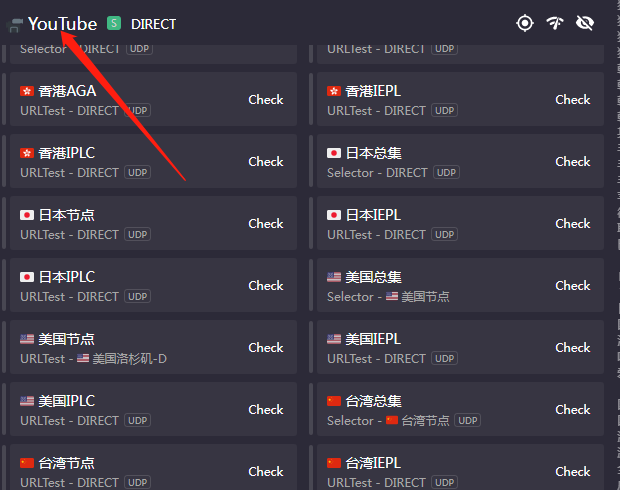 *设置好国外网站这个栏目后,可以访问大部分海外网站,但是如果你有其他需求,例如观看youtube,那你就要找到YouTube这个栏目,然后也是选一选美国或者狮城总集